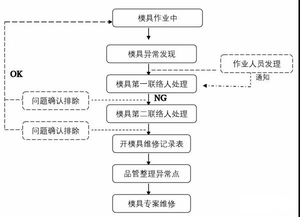 模具在上模前,要檢查螺絲,模具有無定位環,公母模有無松動之異常,當在上模前發現異常應由 上模員及時簽寫模具維修處理單,由模具部盡快安排人員進行處理;